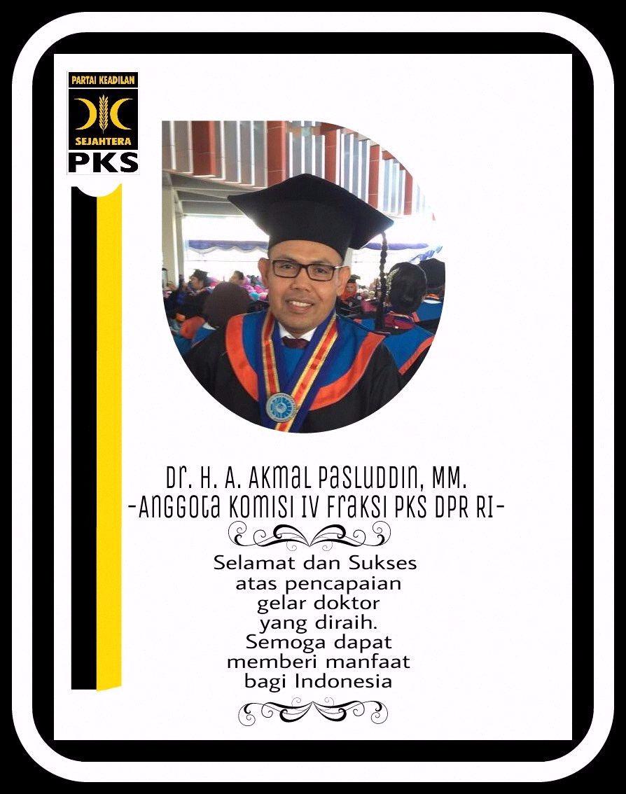 Fraksi PKS DPR RI tweeted: Selamat atas gelar doktoral,Anggota Komisi IV @akmal_pasluddin,dr Universitas Negeri Makassar. Semoga berkah ilmunya