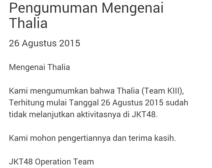 [INFO] Thalia (Team KIII) akhirnya RESMI resign dari aktivitas di JKT48
